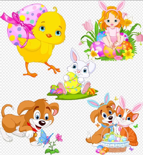 Клипарт - пасхальные персонажи на прозрачном фоне цыплёнок собачонок котёнок PSD 1 | слои раздельно | max 5914 x 6409 | 300 dpi | 23.65 MB