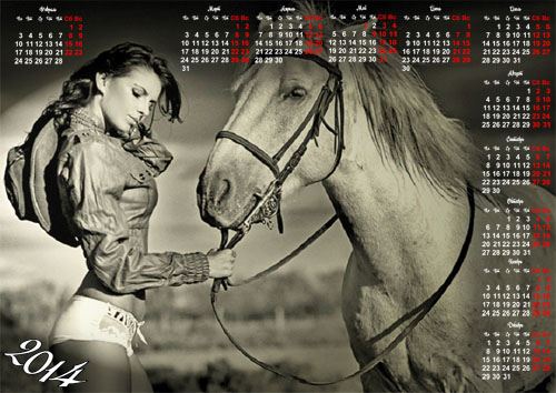 Календарь 2014 - Черно-белый постер лошадь и девушка PSD | 3000x2120 | 300 dpi | 35 мб Автор: Alexey84